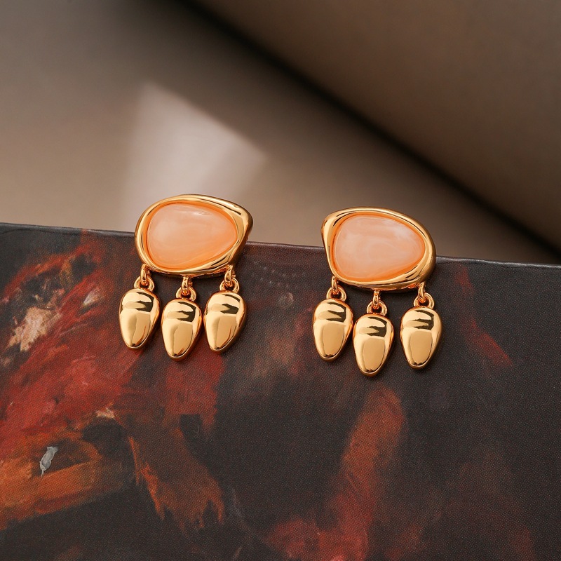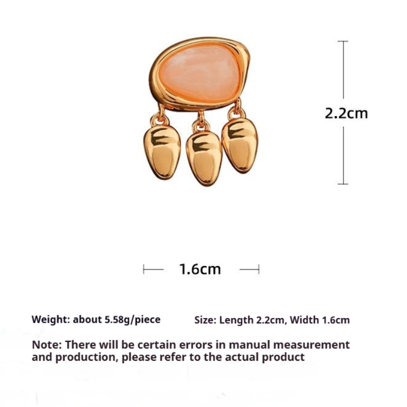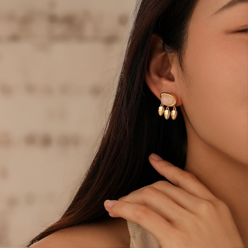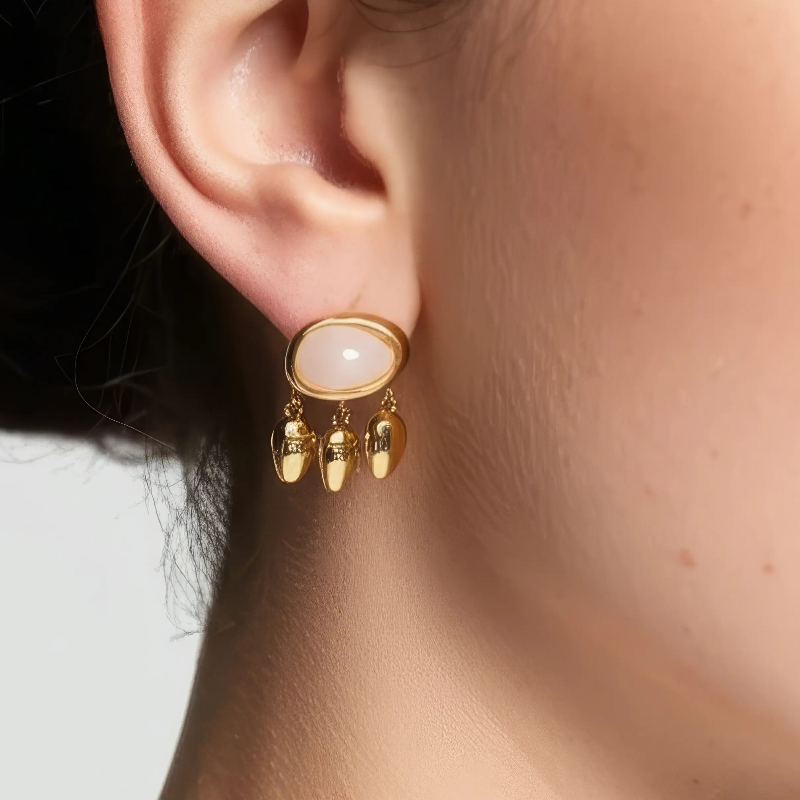 A softly sculpted stone, like the eye of a seer, anchors the design. Beneath it, three molten-gold droplets fall like suspended intentions—graceful, grounded, and quietly magnetic.