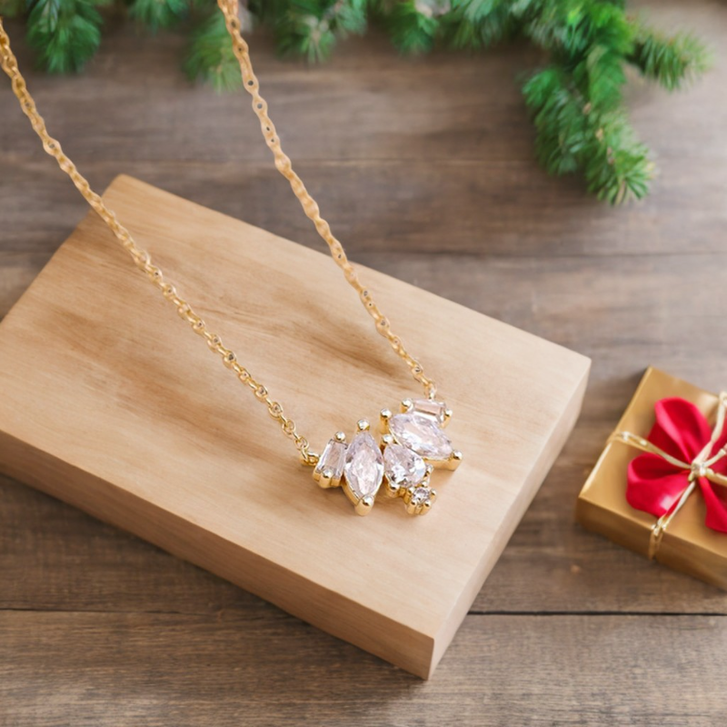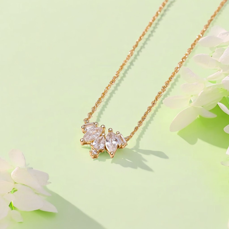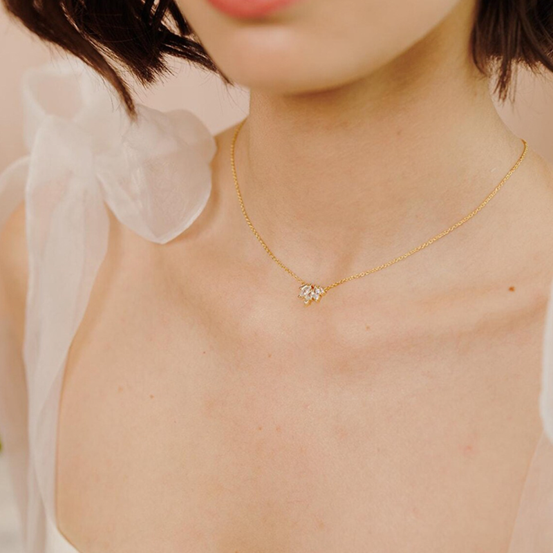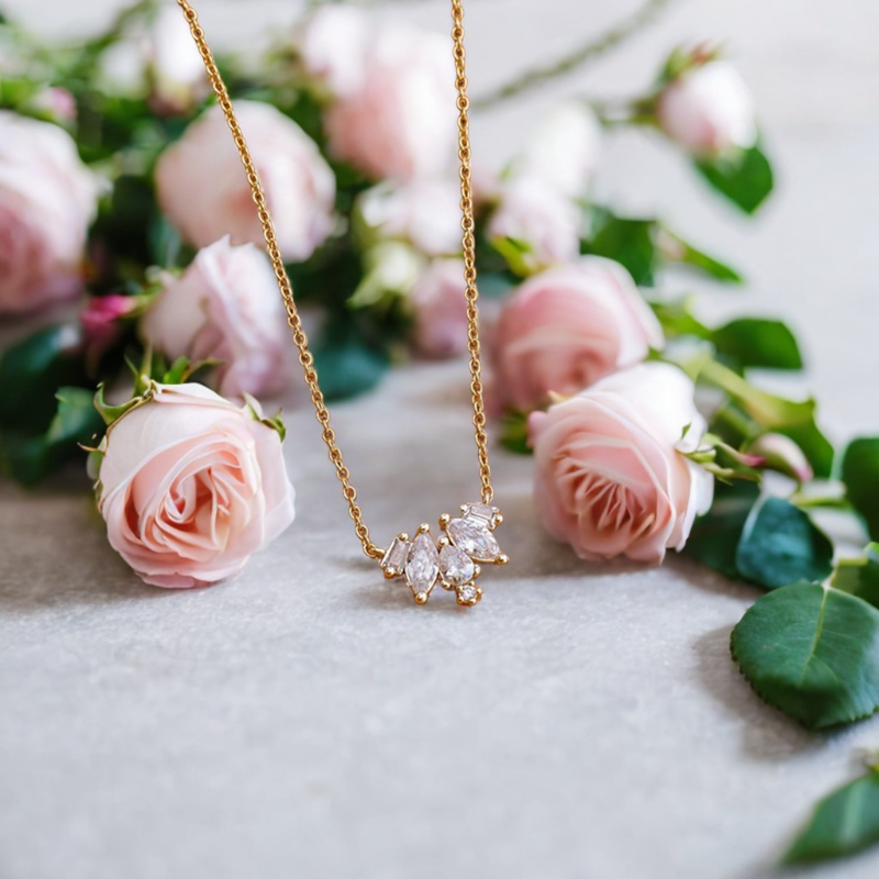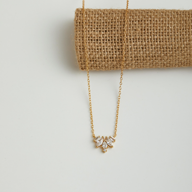 At first glance, the Petal Glint Necklace may seem like a whisper—delicate, quiet, restrained. 🌟 But look again, and you’ll notice the silent clarity in its form: three luminous stones unfolding like petals in mid-bloom.
