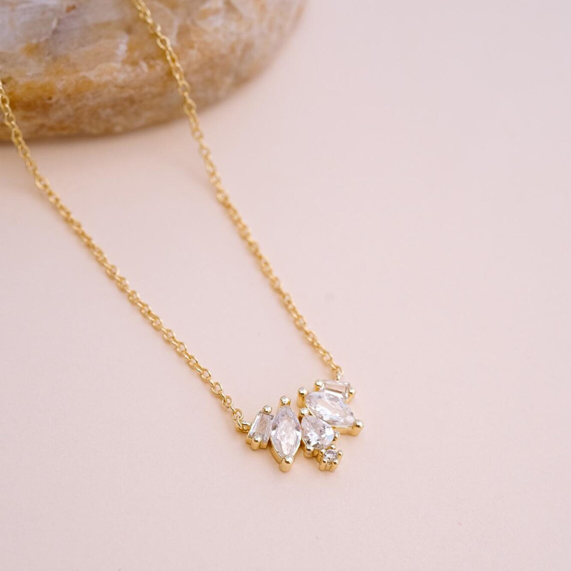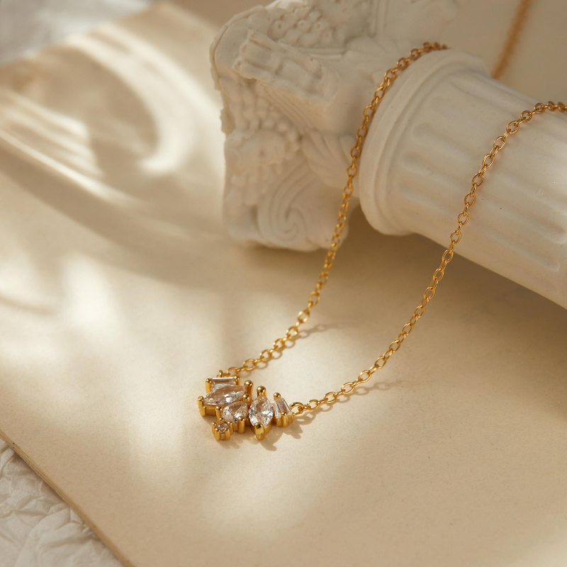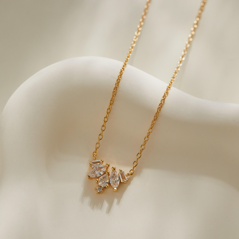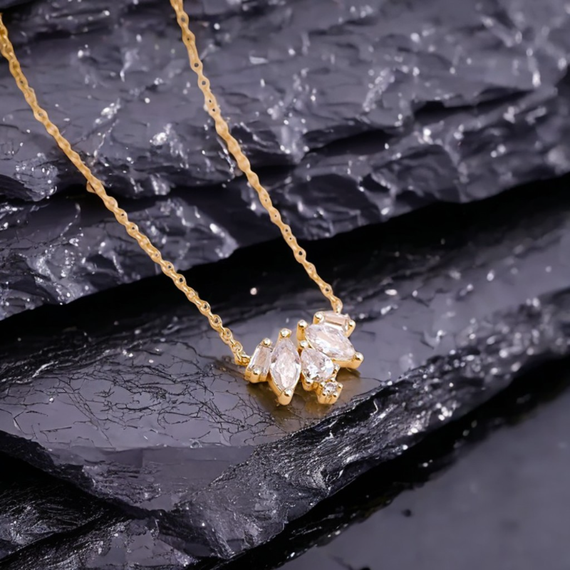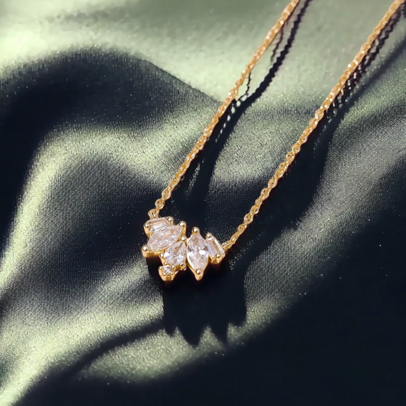 Set in radiant 18k gold plating, these asymmetrically balanced crystals create a glimmering rhythm—soft yet structured, fleeting yet intentional. It’s a necklace made not to dazzle, but to linger.